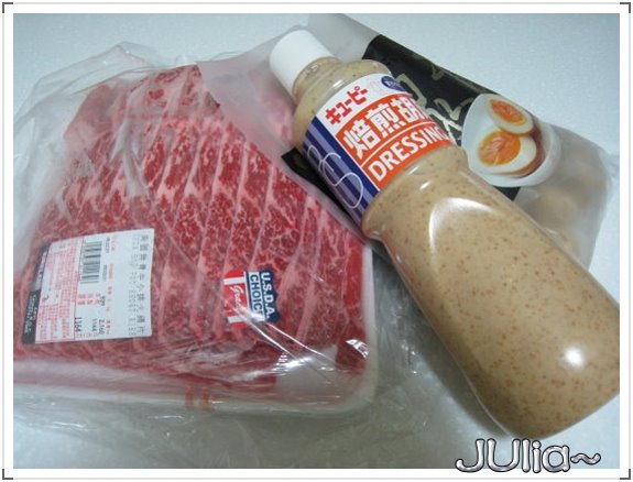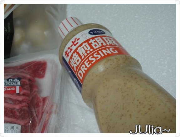 牛小排火鍋肉片、溫泉蛋、胡麻醬。