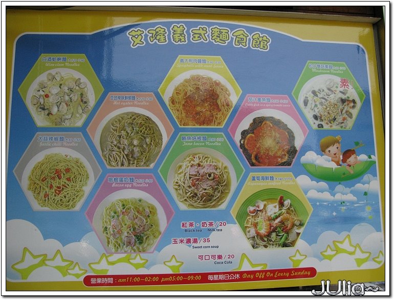 主要就賣九種義大利麵,有分大小,最貴的大概是120大洋左右。