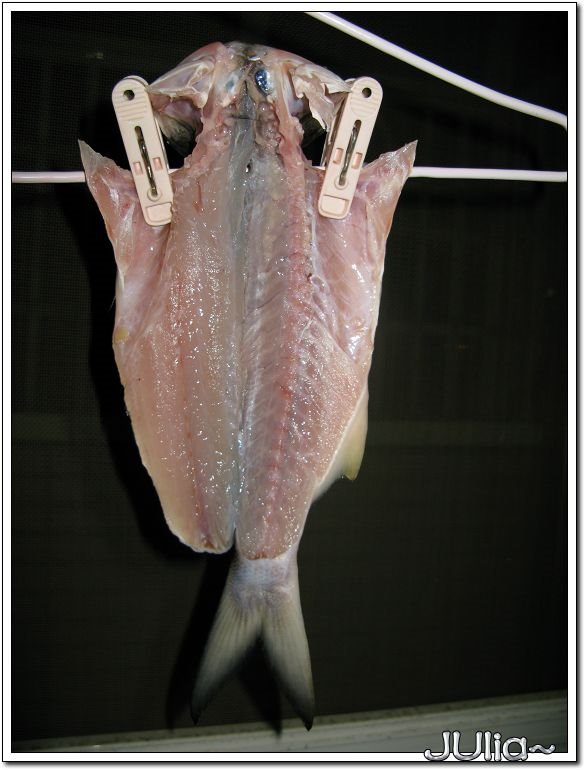 (因為我是在室內風乾,一定要拍乾,要不然醃過於的鹽水滴在地板上應該會發臭@@)