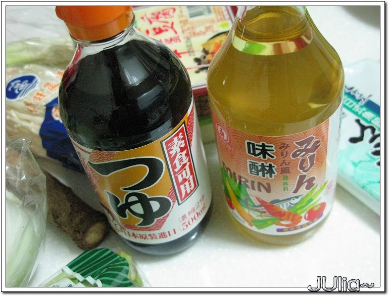 壽喜鍋的必備湯底,味霖和日式醬油,牛蒡一小條,還有米酒、糖。