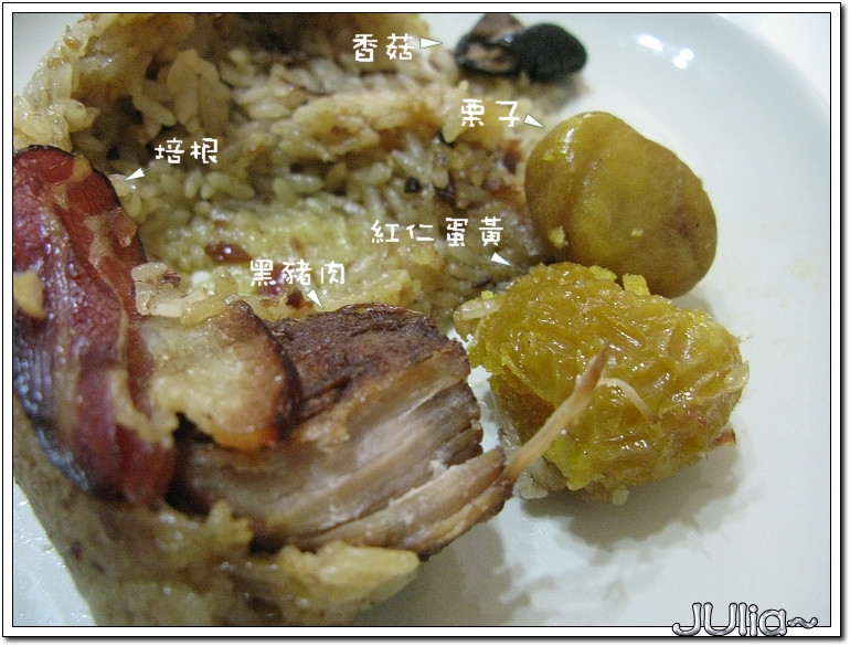 有新東陽嚴選培根、黑豬肉、埔里香菇、口感鬆甜栗子、紅仁蛋黃;糯米也有香氣。
