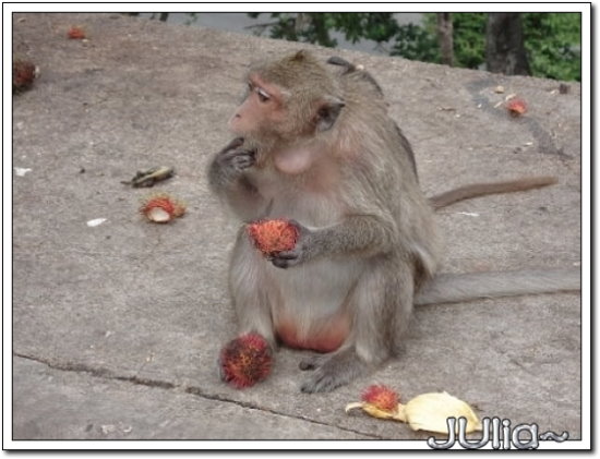我發現有猴子很聰明會直接在水果攤旁邊伺機而動,哈哈!